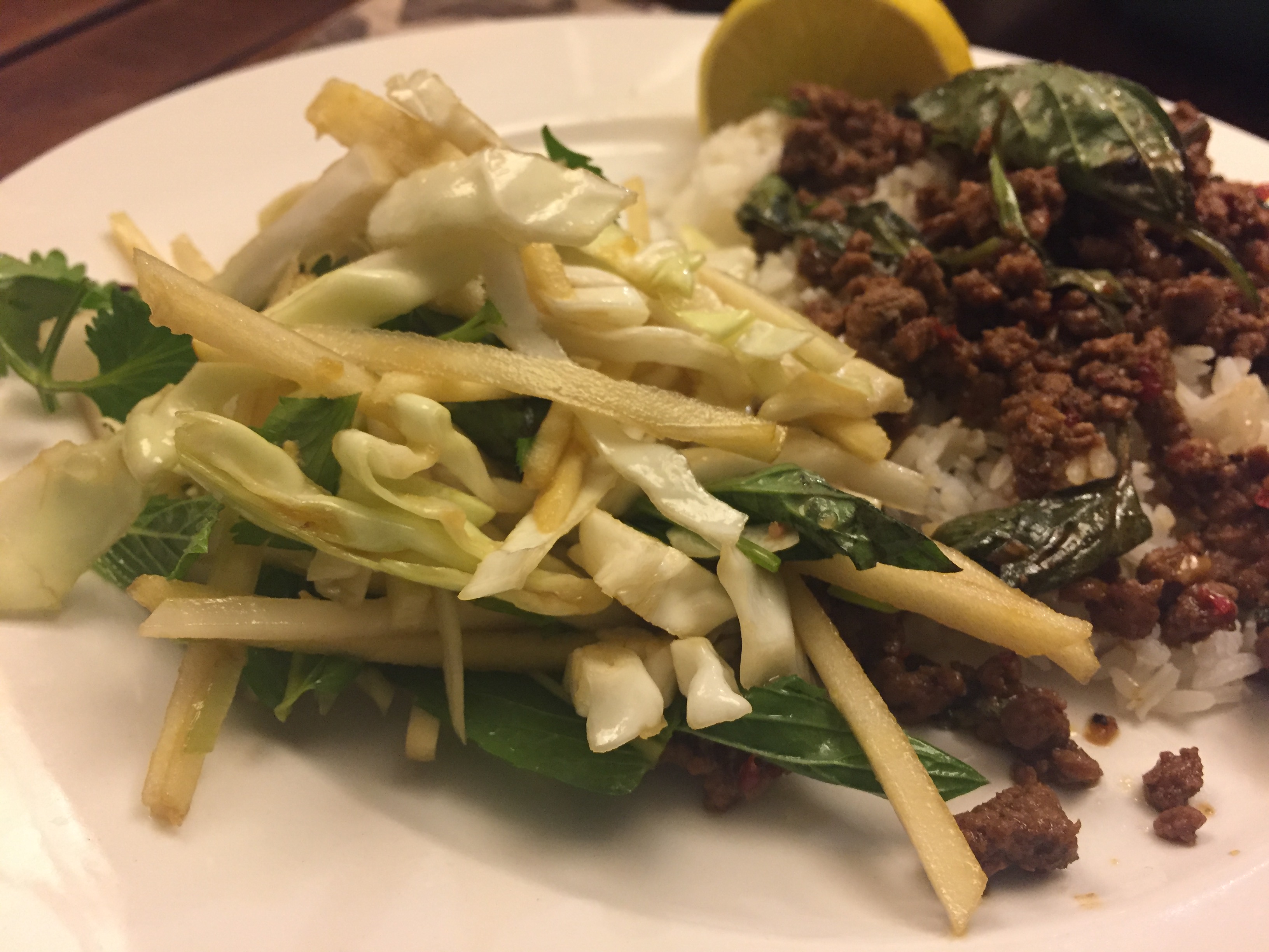 I don’t think I’d eaten kohlrabi before trying this salad, though I’d always admired their rather alien (perhaps triffid like?) style! Kohlrabi tastes very similar to cabbage or turnip but milder and with more dense flesh, and it juliennes easily. Combined with the sweet crunch of apples and fine shreds of cabbage as well as the heat and aniseed kick of Vietnamese mint and basil, it’s a heavenly combination. It’s delicious with spicy dishes such as the Thai beef with chilli and holy basil below.