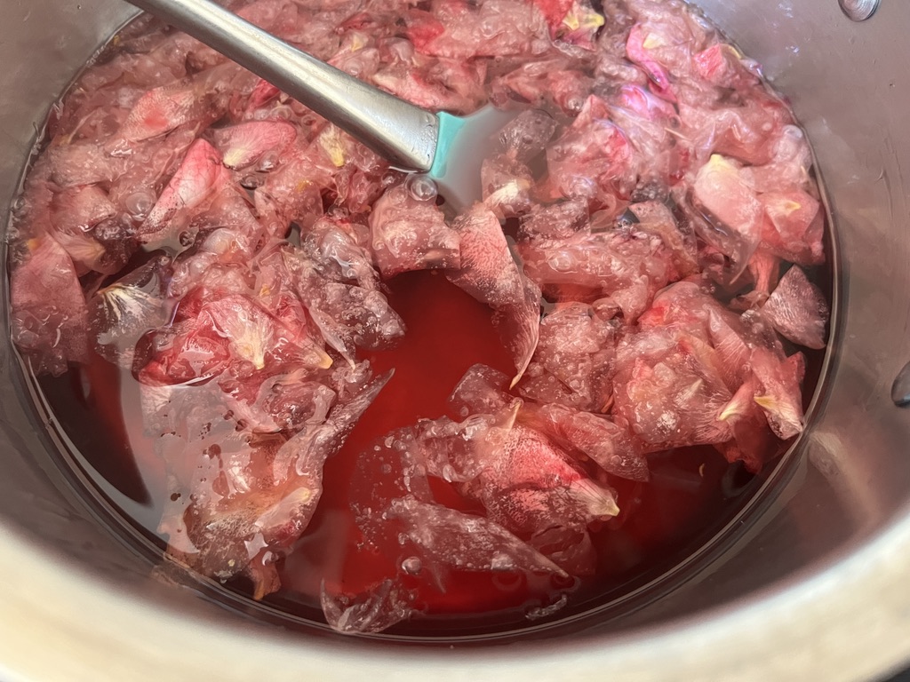 Combine petals in a medium saucepan with juice, sugar and water. Heat gently, stirring until sugar is dissolved, then barely simmer over low heat for one hour. The colour will gradually change from clear to deep pink (depending somewhat on the colour of your roses) and should smell wonderful.